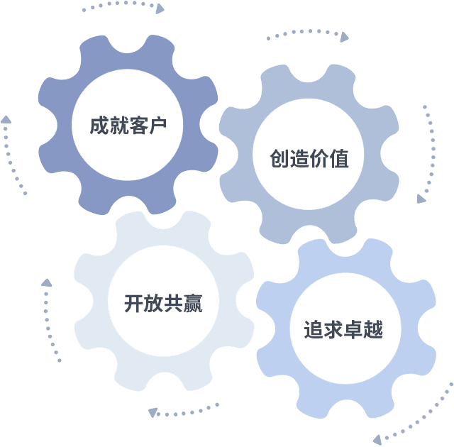 成就客户是一切决策的出发点,,,创造价值是衡量所有工作的标准,,追求卓越是我们做事做人的态度,,,开放共赢是我们的格局也是最终的结果。。价值观的齿轮环环相扣,,,,推动着组织里的每个人不断向前。。。。